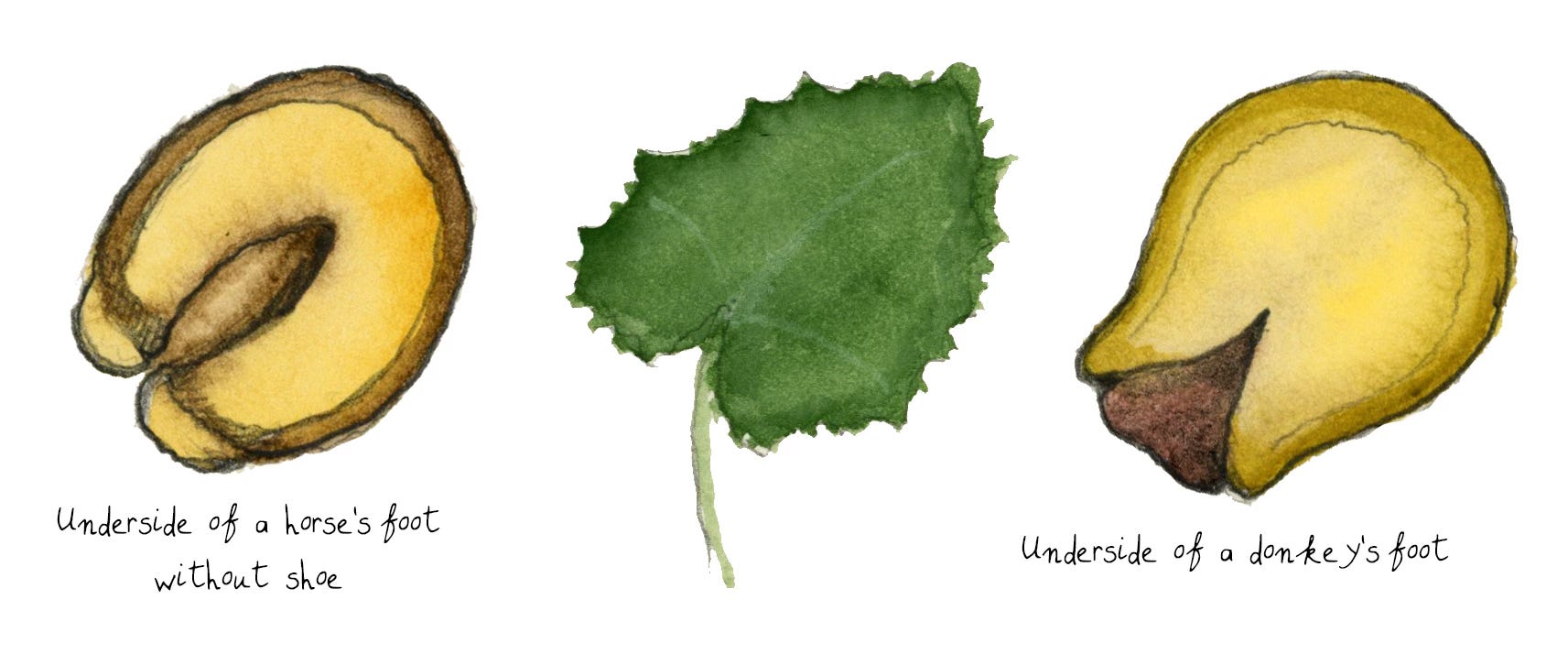 Colt’s foot is named, pretty straightforwardly, after the shape of its leaves which are said to resemble the foot of a young horse. Which they do, pretty much.