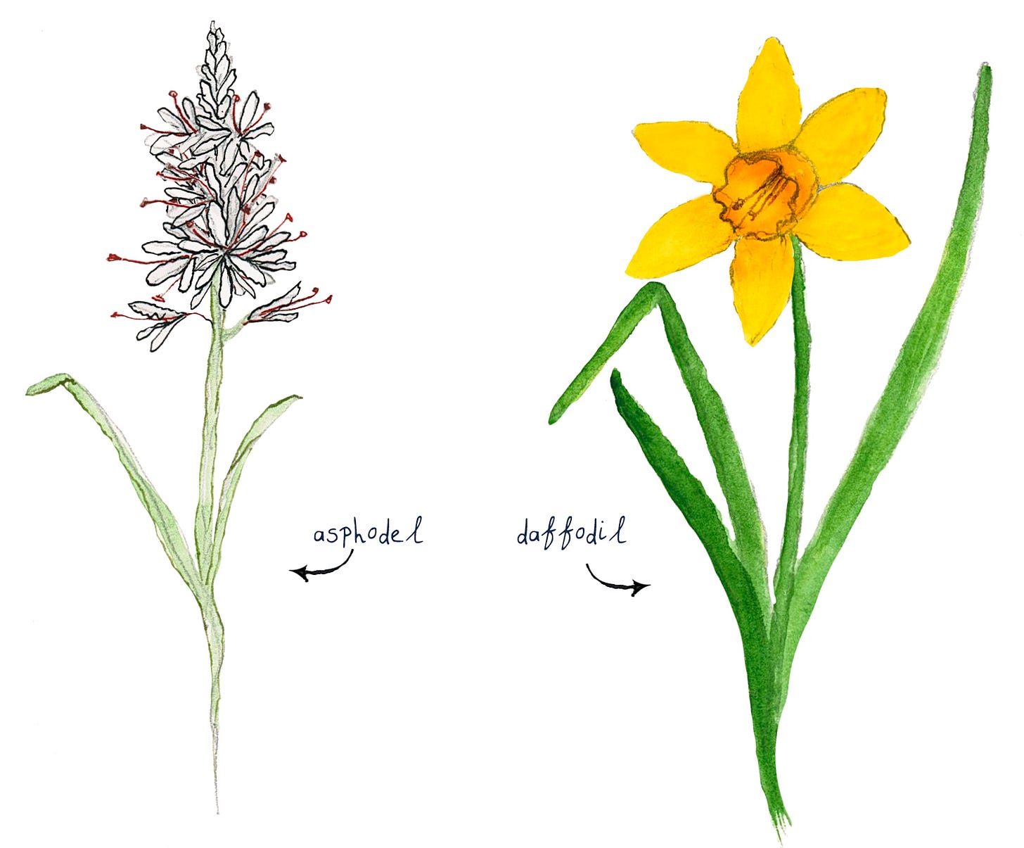 What both plants do have in common, is their perceived connection with death. Asphodel as a plant favoured by Hades, Greek God of the dead, who grew it in the Elysian fields close to the underworld. And Narcissus, in memory of the sad death by drowning of Prince Narcissus.