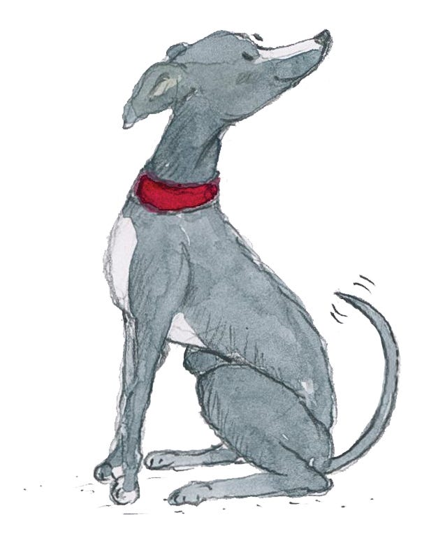 (Our very good boy Flint, who despite liking smelly things, doesn’t like being a wet whippet )