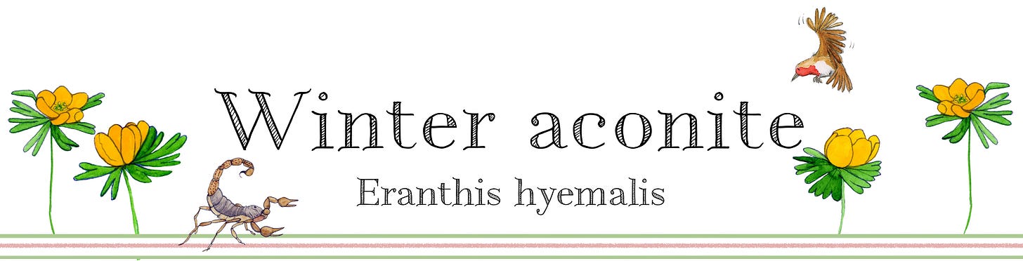Which one could see could be a problem for scorpions if aconites grew in the deserts and arid places where the scorpions tend to hang out, but the winter aconite prefers rich soil, preferably in shady woodlands. So scorpions don’t have too much to worry about. On the other hand, human beings would be unlikely to benefit from aconites “prevailing mightily’ against scorpion “bitings”, unless they were lucky enough to stumble across an apothecary who happened to have some aconite in his war chest that he’d collected from distant climes. A bit of a long shot.